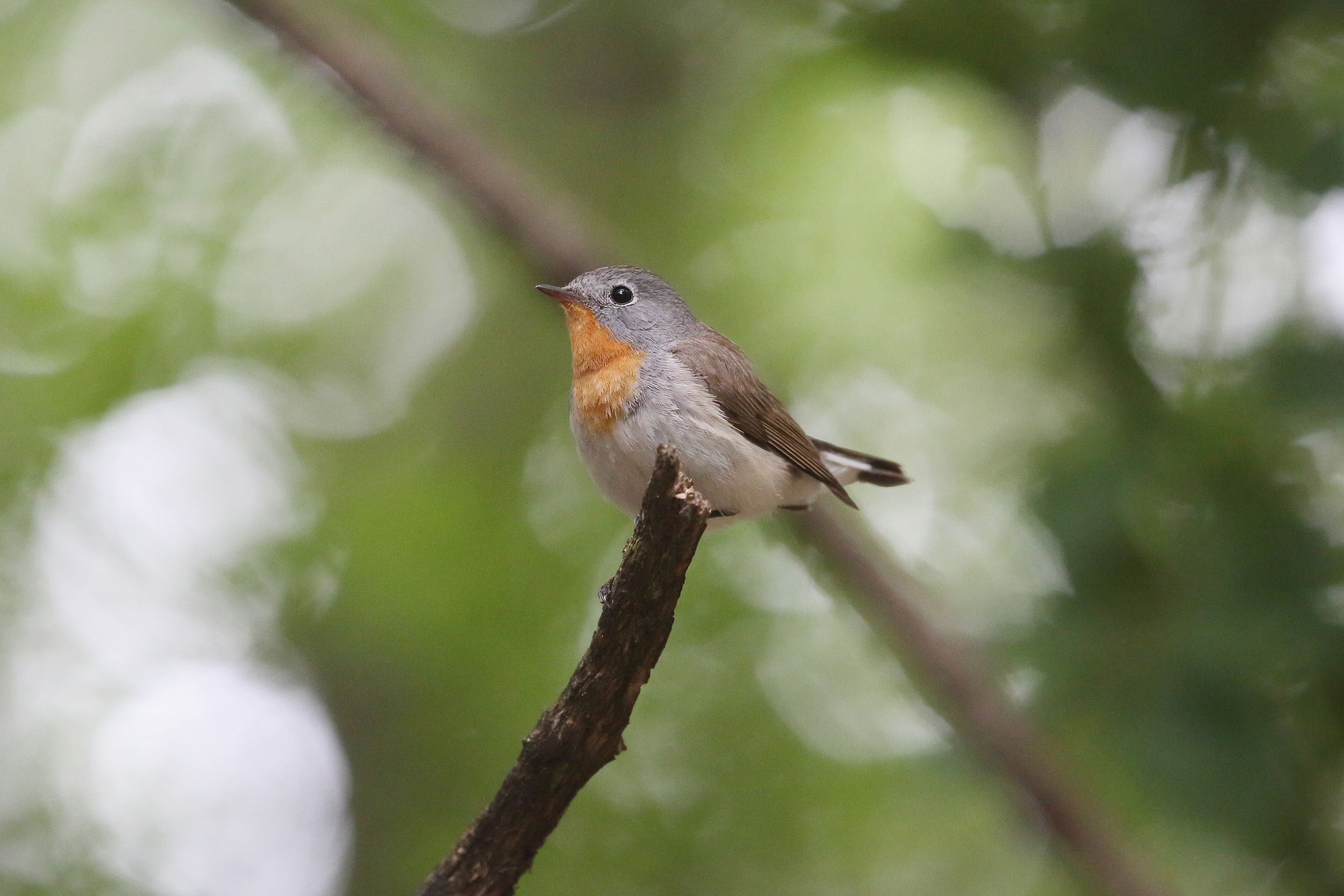 Der Zwergschnäpper ist ein kleiner Schnäpper, der sich vorwiegend im mittleren und oberen Kronenbereich von Bäumen aufhält. Er ist selten zu sehen, dafür umso öfter zu hören. Mit etwa 11 cm ist er z.B. nur wenig größer als ein Zaunkönig. Als Zugvogel ist er von Mai bis Anfang September bei uns zu beobachten. Das adulte Männchen hat eine orangerote Kehle, Weibchen und nicht ausgefärbte Männchen sind beige-weiß. Die Kehle der jungen Männchen ist darüber hinaus nur unvollständig gefärbt. Die weißen Außenschwanzfedern sind von der Nähe gut zu erkennen.